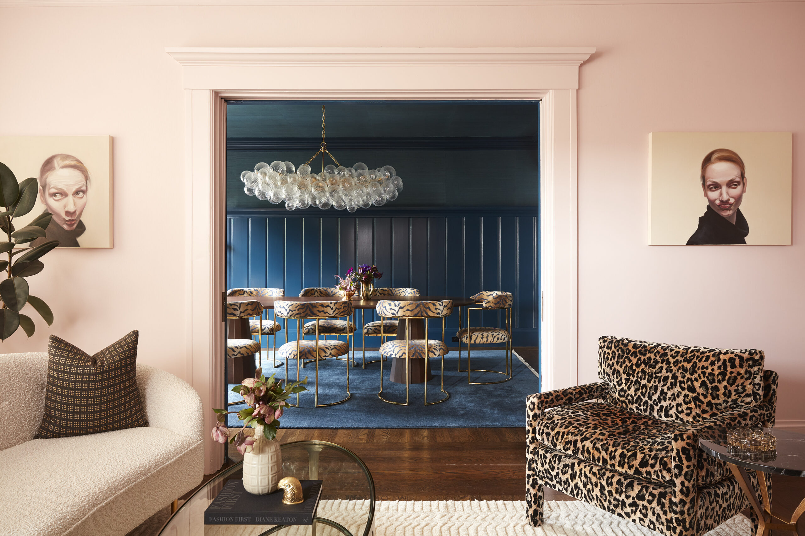 Ricki Stevens Design realizes a modern home with old-world charm In the family room, the coffee table and ottomans are by Four Hands, the sofa and swivel chairs were custom made by RSD. The chandelier is by Currey + Co. and the sconces are by Mullan…