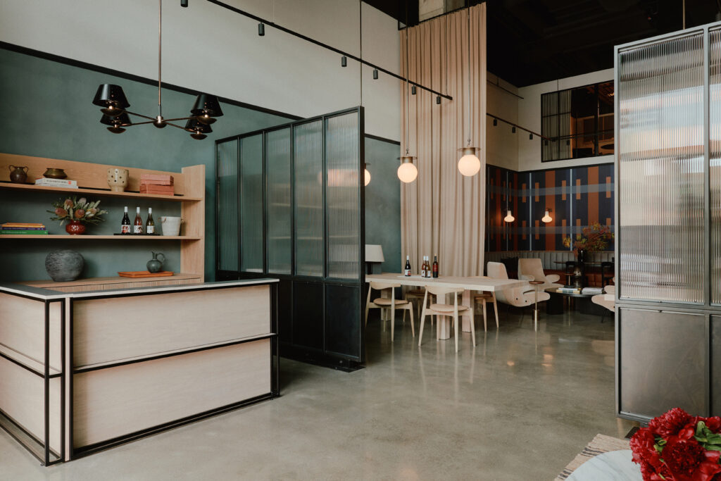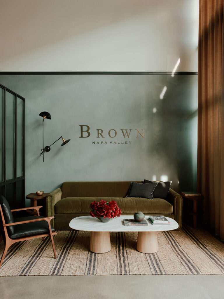 Author:Anh-Minh LeAfter designing Brown Estate’s downtown Napa tasting room in 2017, Catherine Kwong was enlisted to tackle the concrete box a couple of doors down, transforming it into an elevated office, a.k.a. Brown HQ. “It’s an industrial space, so we wanted to highlight those elements—the super-tall ceilings and windows, and the polished concrete floors—by layering in luxe materials like soft wool drapery, patinaed bronze lighting with opaline shades and leather and mohair seating,” she says.