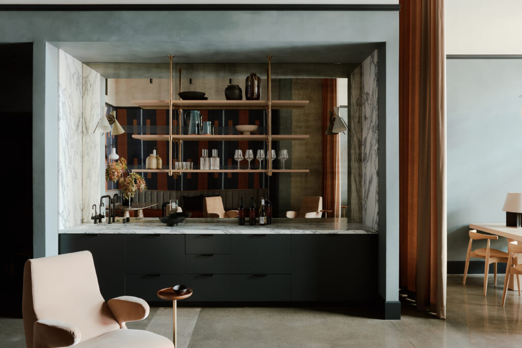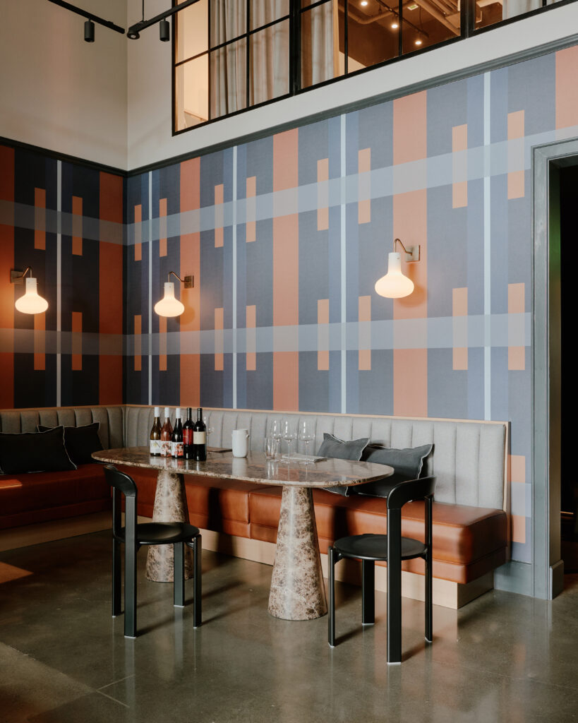 Taking cues from residential interiors, Kwong conjured a workspace that is always “guest ready,” with zones for various functions, from meetings and presentations to tastings and private events. A pop-up tasting bar for the Brown Estate’s House of Brown label allures near the entrance. A key aspect of the project was creating a mez- zanine area that allows for sequestering desks, monitors and “the mess of daily work,” as Kwong describes it, “without worrying about disrupting the magic going on downstairs.”