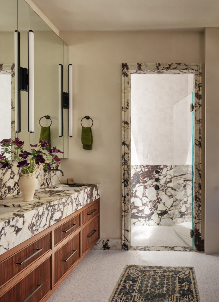After resolving the floorplan, Kim focused on layering delicate finishes and materials that make the space feel like a peaceful spa escape. “We wanted to create a space that was softer and more tactile, with richly layered materials and textures—the gorgeous and dramatic Calacatta Viola marble, a walnut vanity with reeded drawer fronts adding a traditional touch, limewash paint to add subtle texture, the sheer wool drapes softening the room and the gorgeous smoky bronzed mirror wardrobe doors and integrated LED lighting contributing a contrasting modern edge,” Kim notes. The new bathroom screams elegance and ease. When asked how the clients feel about the transformation, Kim proclaims, “They love how elegantly refined the space is and how effortless it is to be in the space, with all of the little details thought through with careful consideration of how they, the clients, would ultimately move through the space and what would feel best.”