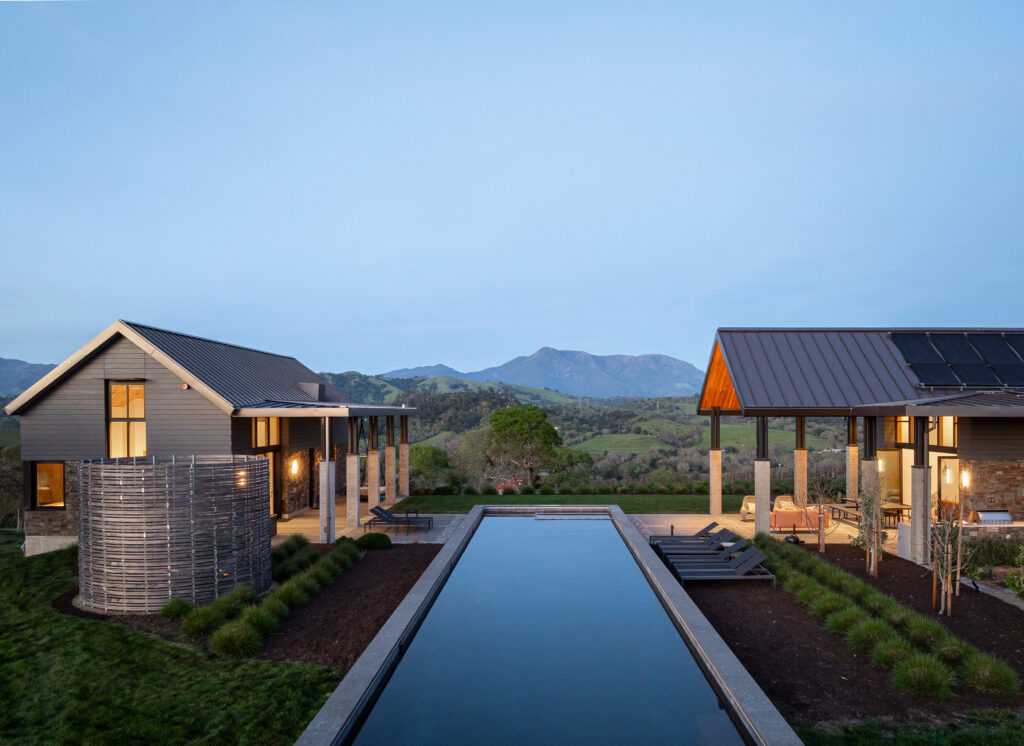 The new, 8,000-square-foot home was designed as a weekend retreat for extended family and friends where they could enjoy the surrounding vineyards, oak-studded ridges and sweeping views of Mount Saint Helena. “The home needed to provide both private and communal spaces for multiple generations, integrate indoor and outdoor living, and harmonize with the natural landscape,” says Wilson. “The house is organized along a strong axis oriented toward Mount Saint Helena, emphasizing the visual connection to the landscape. Composed of distinct volumes inspired by Sonoma County’s agrarian vernacular, gabled forms are connected by secondary circulation volumes.”
