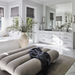 Her philosophy winds its way throughout the house. The husband’s request for a place to watch TV that wasn’t the bed manifests as a cozy seating area that adds intimacy to the primary bedroom. A sprawling channel-tufted ottoman and a vintage rug does the same for the primary bathroom. In the family room, the laid-back vibe implied by the pair of sturdy oversize coffee tables, the plump sectional crowded with cushions and a plush Moroccan rug balances the air of Hollywood glamour jump-started by the room’s color and confirmed by the undulating custom console table and the room’s vibrant art. “Art is so important, especially in a house this large and stark,” says Palevsky, who worked with curator Sophia Penske to source the pieces for the home. “Especially now that they’re collecting across mediums in addition to photography, the artworks’ depth and texture really helps to add another layer.” The result—an exquisite harmony between devastatingly sophisticated and astonishingly livable—is Palevsky’s signature.