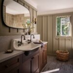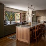 One of Jones’ favorite spaces is the jewel box kitchen that is full of character. “While modest in scale, every detail is fully realized, highly functional and balanced,” she says. “The yonder backsplash tile and RTO lighting over the island add a playful nod to the olive green and walnut cabinets. The hand hewn solid brass hood and cabinet hardware will continue to age and patina giving the space life. The result is unique and fun without being precious. The tones also blend beautifully to the backyard and feel one with the land.”