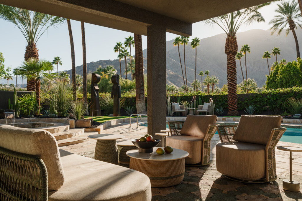 Outdoor furnishings are by Tidelli, and the towering sculptures are from Peri G. Fine Art in the reimagined backyard. Boudreau’s remodel improves the views of the San Jacinto Mountains— the deciding factor that made the clients fall in love with the property—both indoors and out. Photos by Lance Gerber.