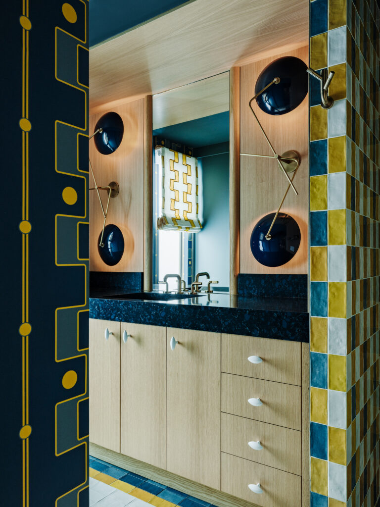 Boudreau engaged in pattern play using zellige tiles from Design Collaborative and retro-inflected Blueprint Lighting sconces to lean into the residence’s mid-century roots and tie back to Frey. The vanity is topped with Indigo quartz sourced from Willis; plumbing fixtures are Brizo. Photos by Lance Gerber.