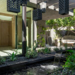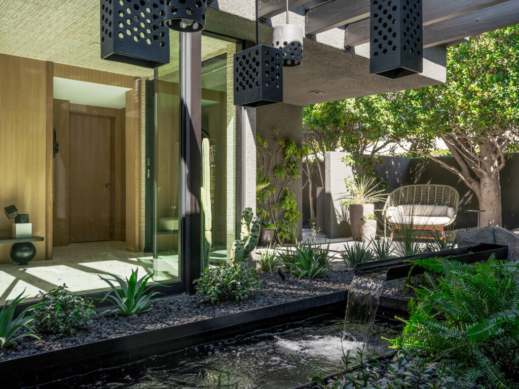 Both the front and rear elevations required particular attention in this regard. At the main entrance, which is accessed via a set of double doors from the street, “you have this amazing courtyard,” which begged for a fresh take. Boudreau introduced a cluster of perforated atmosphere-creating lanterns that hang over a newly installed water feature surrounded by lush landscaping. The enchanting exterior vignette continues to engage with the living room and kitchen thanks to a glass front door and floor-to-ceiling windows. “It organically feels like you’re outside and is much more spacious, because you’ve got this open atrium and then this big view out,” Boudreau states about the ample fenestration on both sides of the house.