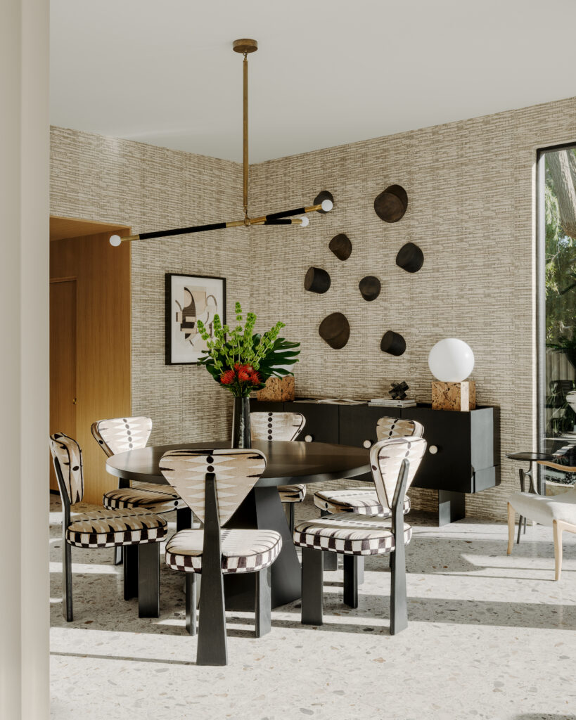 Apparatus’s Arrow collection chandelier illuminates the playful dining room, which is anchored by an ebonized Vesta dining set with Schumacher’s dynamic Backgammon fabric. More chromatic contrasts come in the form of works curated by Peri G. Fine Art in Palm Desert. Photos by Lance Gerber.