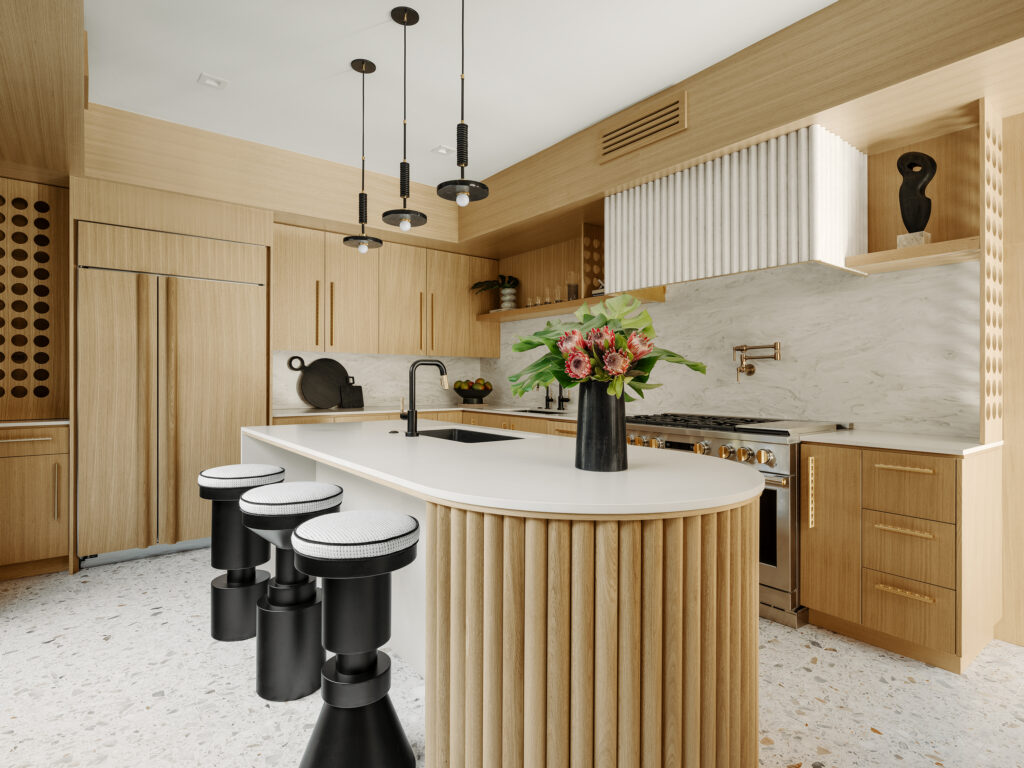 A trio of Piccadilly counter stools by Vesta sits at the kitchen island, on which the reeded white oak detail is an example of how Boudreau drew inspiration from seminal modernist architect Albert Frey, who expanded the house during the 1980s. The backsplash and bespoke reeded Corian Solid Surface in Sand Storm cooktop hood, as well as Lapitec counter surfaces, are sourced from Willis.