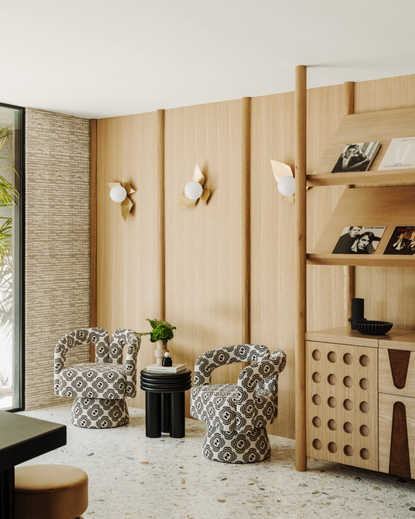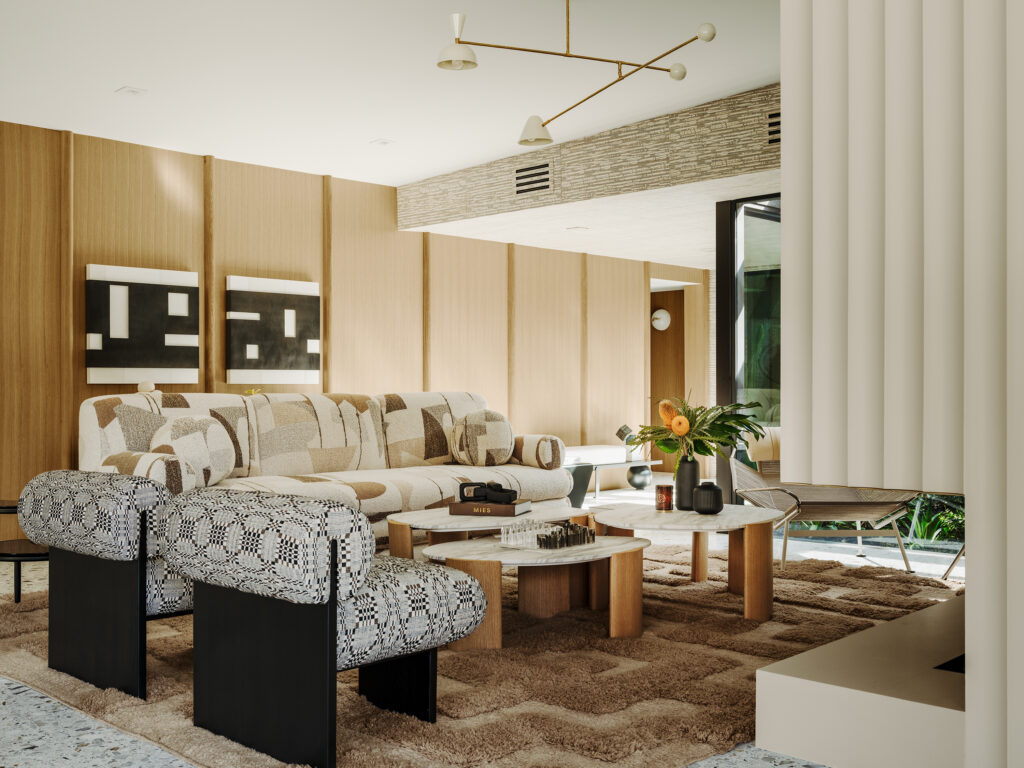 The primary suite lounge stands opposite the white oak room divider, providing a transition from this private area to the backyard and pool. Boudreau designed the sofa to complement the Vesta coffee table and armchairs over a multidimensional gridded Soukie Modern rug. Photos by Lance Gerber.