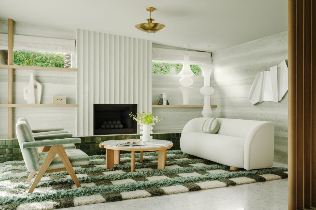 In the living room of the project—also a Feature Showhouse for Modernism Week in February 2025—Boudreau composed a calming yet lively scheme atop a custom Soukie Modern rug. Schumacher fabrics cover a sofa of her own design and a lounge chair set, which is among various pieces by Vesta. Photos by Lance Gerber.