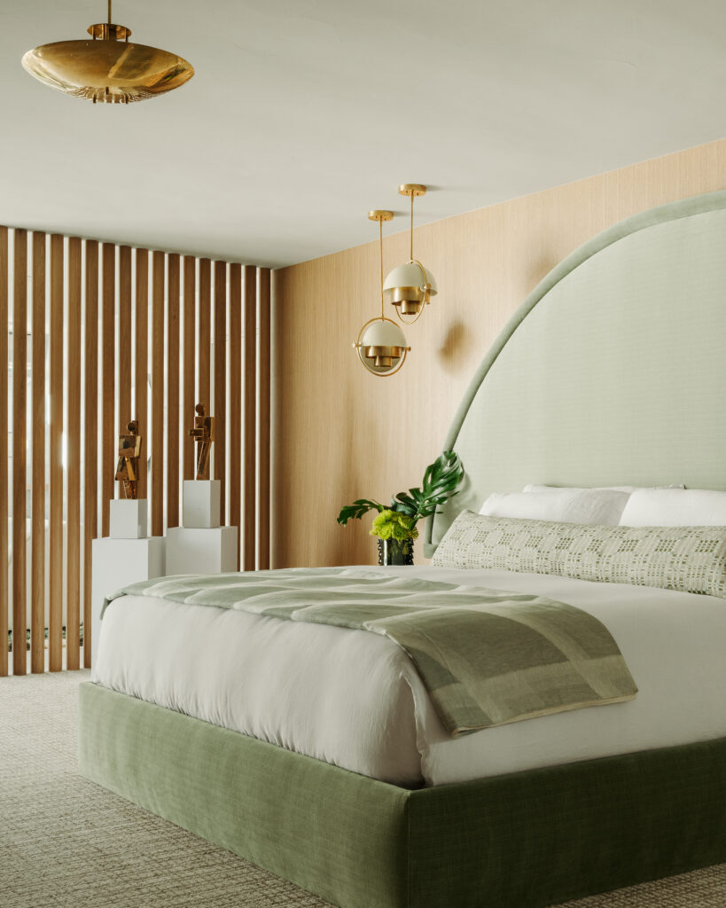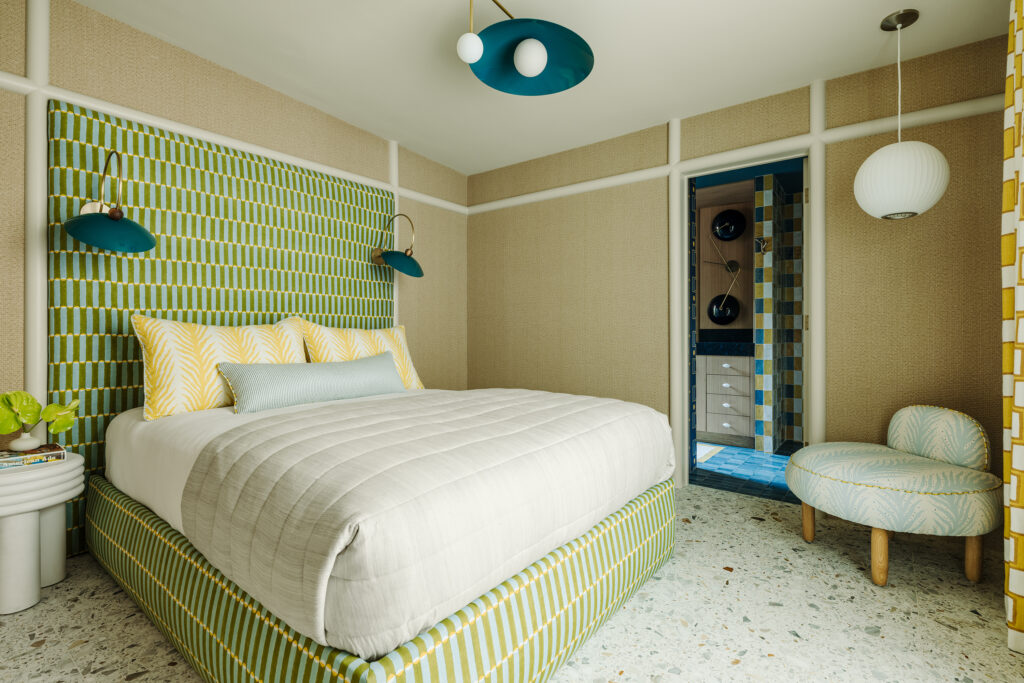 Calming sea foam greens are the pre-dominant tone in the luxurious primary bedroom, while in the guest areas Boudreau could get more experimental and embrace the Frey-oriented narrative. One guest suite is “an homage to his color palette,” with blues and yellows loosely pulled from sites like the Frey II and Cree houses as seen in dynamic Schumacher fabrics and Blueprint Lighting fixtures. “It’s nice to have rooms [with] something interesting that can be different,” she shares. “That’s really fun, and still speaks to the thematic approach.”