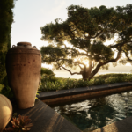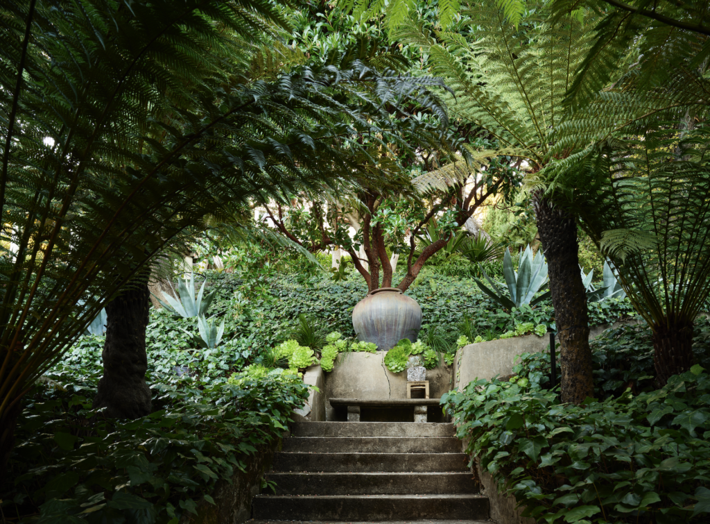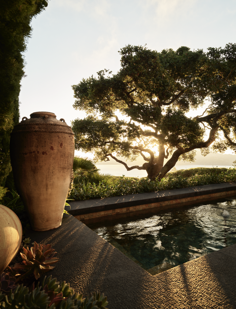 Whether integrating global pieces into his designs or embarking on projects overseas, travel plays a significant role in Wiseman’s practice—and the same holds true for his garden. The tall Balinese pots were handmade in a primitive kiln. On a loggia, he devised the teak “Bali bed,” topped with cushions covered in a Perennials fabric by Rose Tarlow. Like all of the furniture outside, the daybed was made by Munder-Skiles.
