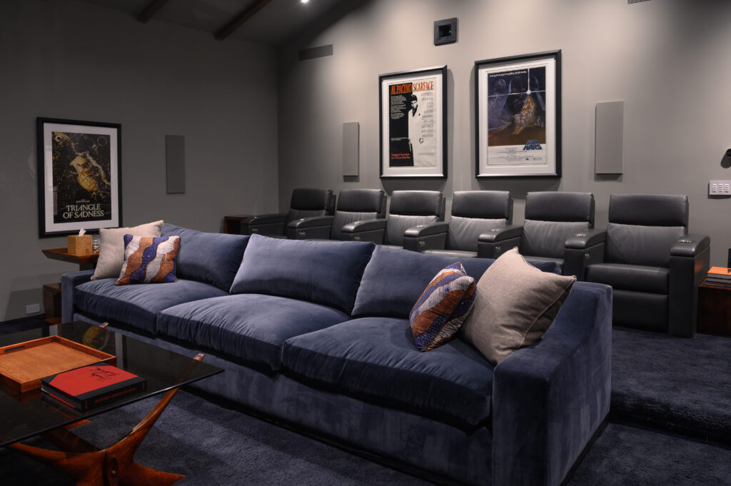 Any doubts about the home’s emphasis on relaxation are banished by a glance at the bathroom. Designed as a full wet room, it features a steam shower, a Japanese-style hot and cold plunge, a whirlpool jet tub, and a “Mr. Steam” steam room complete with aromatherapy and smooth dark walls the conjure up a cool cave. The bar confirms that friends are welcome. “We wanted to find a way to dress up the bar front, and the idea emerged to incorporate red cement bricks, which would add a sculptural element while still being mindful of the budget,” says Gordon. “We were poring over a stack of Japanese interior books for inspiration and stumbled upon a particularly beautiful Japanese brick that inspired us.” The team ordered a slew of sample, settling on a “cored” brick that was the client’s favorite. “The pattern features negative space, creating an artistic moment that isn’t immediately apparent when you think of brick.”