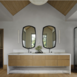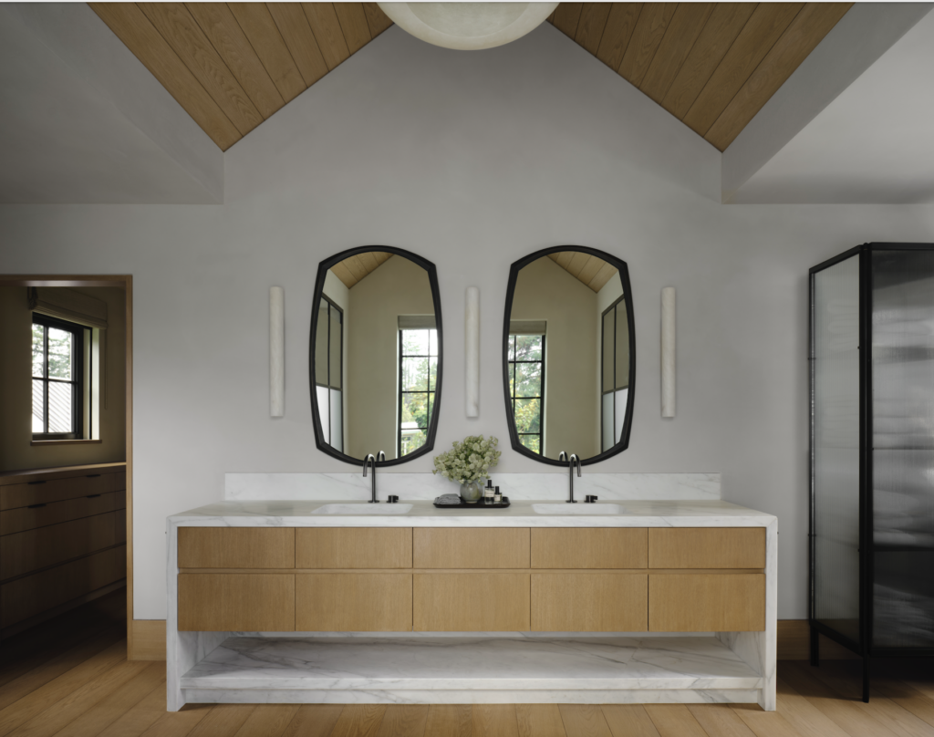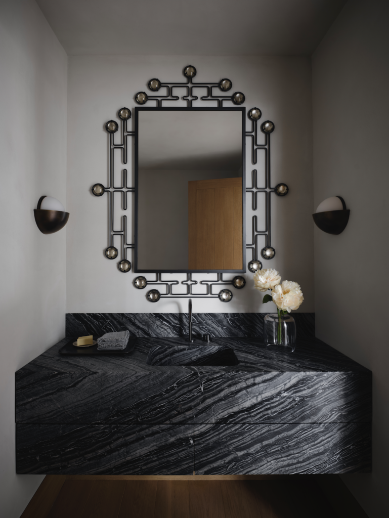 Over the course of the project, the flooring was reconsidered too. A wood with more knots and texture was a contender. “We ended up moving toward cleaner, rift-oak materials and a quieter palette,” Hollis says. Oak appears on the ceilings and is used elsewhere as well, such as the handrail of the central staircase and artist Ingrid Donat’s sculpted wall panels for a powder room. The latter space further includes a couple of striking custom elements: a hand-forged brass pedestal sink sculpture by artist Mauro Mori and a Tuell & Reynolds mirror consisting of a hand-cut layered steel frame with textured bronze accents. The client observes that “The way all the different materials—woods, metals, stone, fabrics, plaster–came together and worked together inside the house is amazing to sit with and appreciate every day; it’s modern and warm.”
