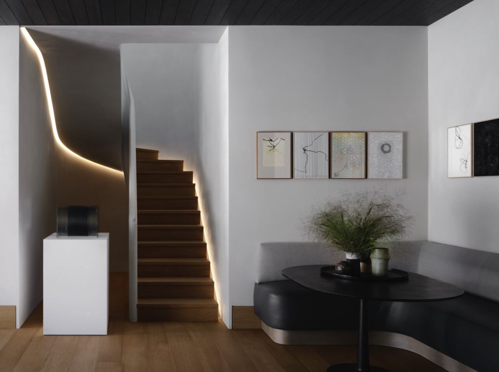 As striking as the main stairs are, Garber is partial to the other stairs in the home, which connect the main floor to the lower level. The architect estimates that Mist and his crew built these stairs five times. Just as the posts in the central stairwell echo other metal aspects of the home, including the kitchen’s steel hood, this curved staircase composed of plaster relates to the walls. The plaster cap on top of the handrail proved a significant feat. Referring to it as “a work of art,” Mist shares that “it was all built by hand on-site, so it was important to make sure that that curve worked and came together.” The stairs feature integrated lighting along the edge that produces a glowing effect.