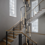 The project’s fluidity, inside and out, required that all parties involved work hand in hand. “It was collegial from the start,” Garber says. “And I think people really fed off of each other’s energy.” The central stairs are a prime example of not only the undertaking’s collaborative nature, but also its evolution. An early rendition called for solid balusters. However, once Hollis introduced a custom chandelier by Vincenzo De Cotiis, comprising antiqued silvered glass tubes and spanning the home’s three levels, a pivot was in order. Opaque balusters would essentially be a “competing element with this beautiful sculpture that’s hanging down through the middle,” Prior explains. Hence, the final design features glass panels framed by vertical steel posts.