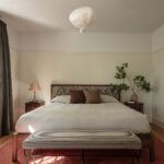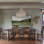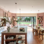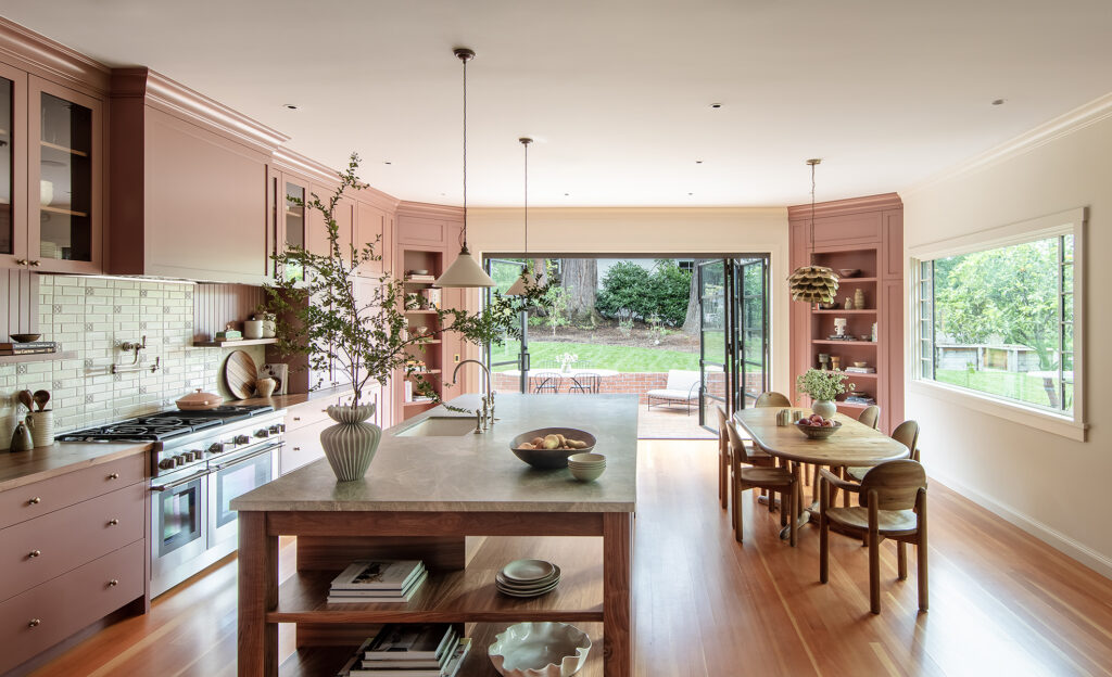 The reorganization continued in the kitchen that originally faced the wrong way, creating for bad circulation. The team restructured the ceiling which allowed them to orient the space toward the garden. “This created a unified look and feel within the kitchen and seating area,” he notes. “The saturated color palette absorbs the abundant daylight and creates a counterpoint to the green gardens just outside.”