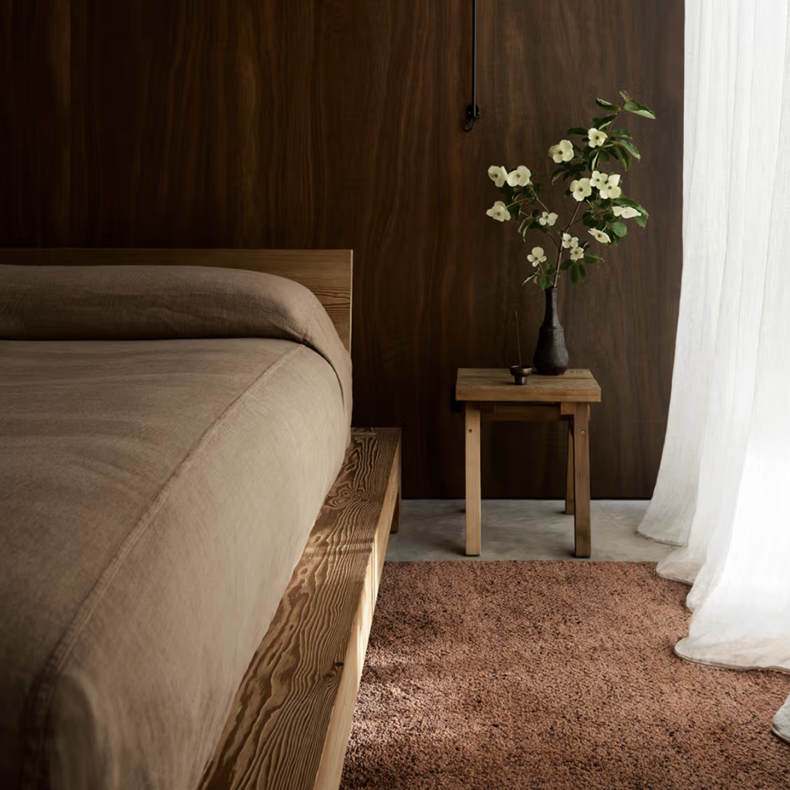 Just in from Armadillo, the Meadow rug shown in Brick, is made using a hand-knotted checkerboard weave of wool, paying homage to iconic tweed from the 70s that is both lush and sculptural.