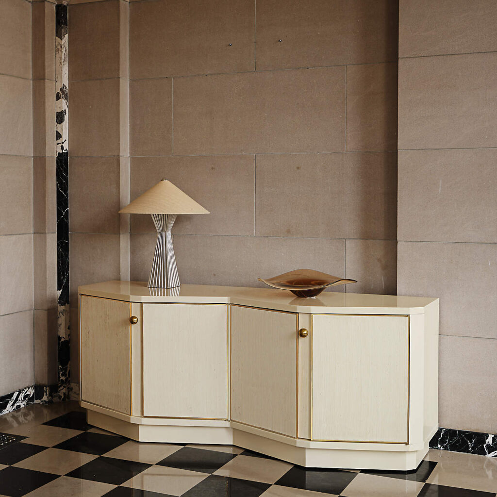 Vesper 76″ Brass and Grasscloth Storage Media Console