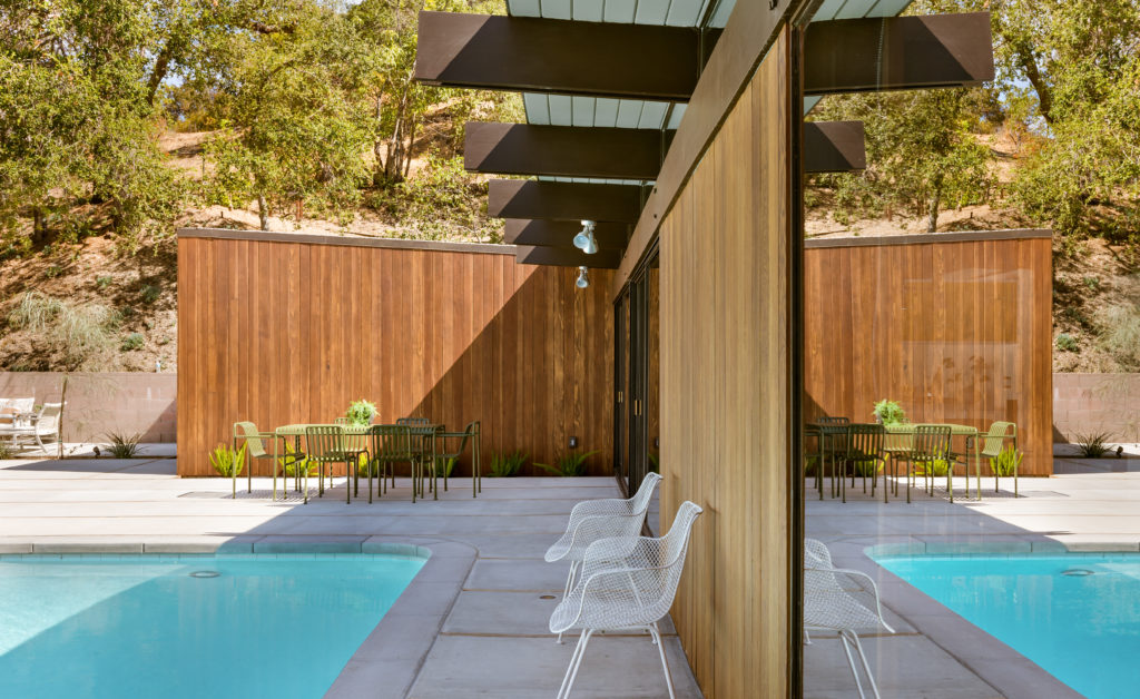 In classic Mid-Century style, it presents a minimalist street front, not unlike an isometric drawing, and opening up in the back to the view beyond the pool and patio.