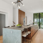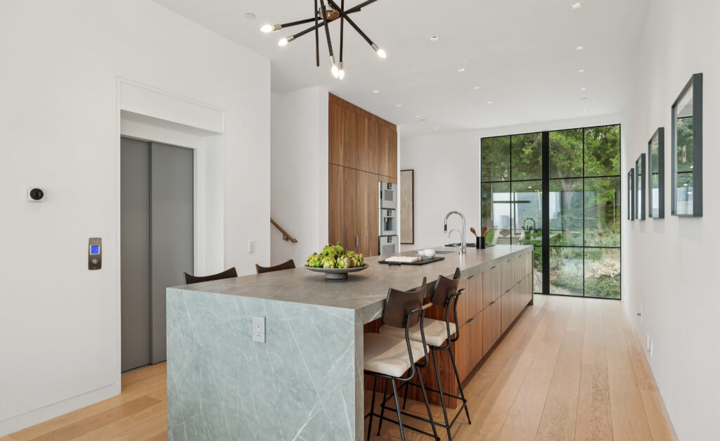An expanse of Fleetwood windows open up the living room to the outdoors, and just above, the dining area and kitchen occupy an entire level. All interior levels are served by a fully automated elevator.