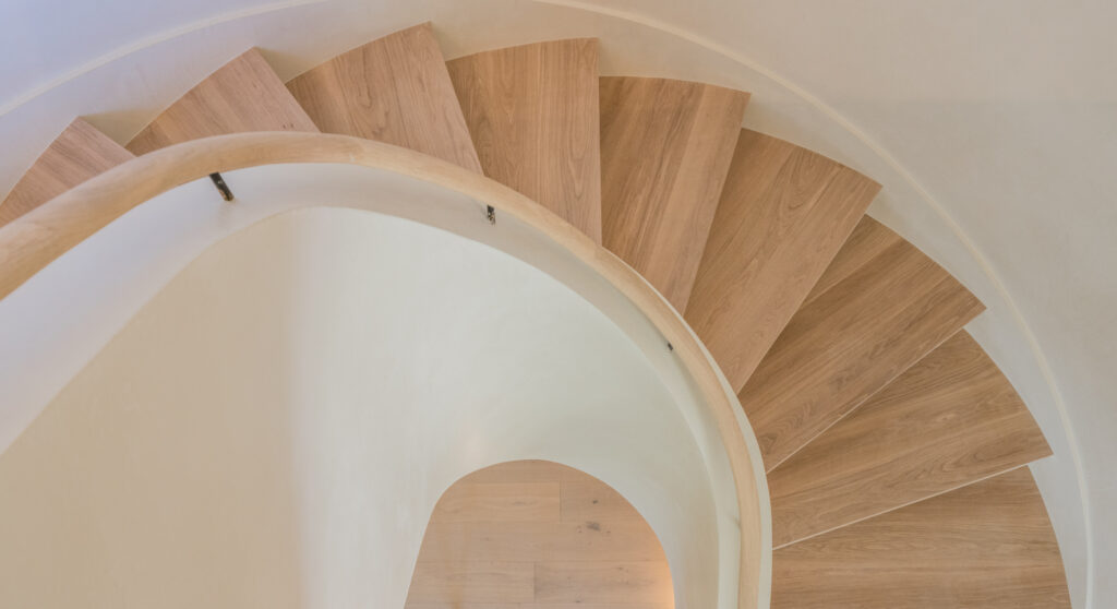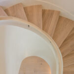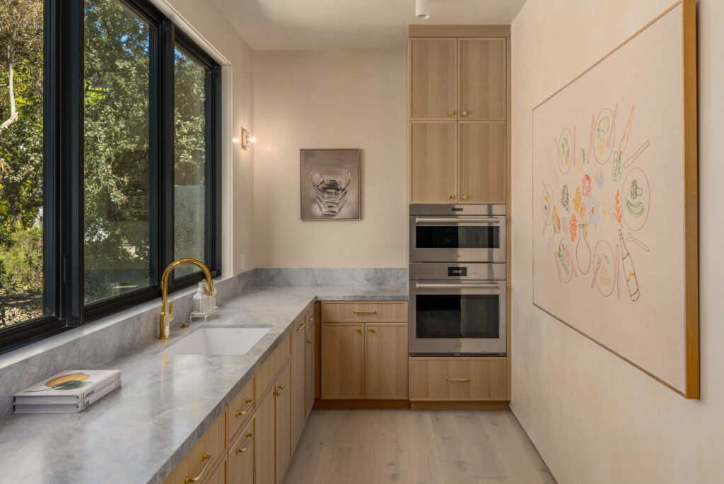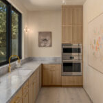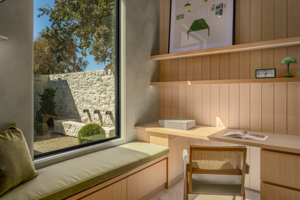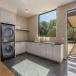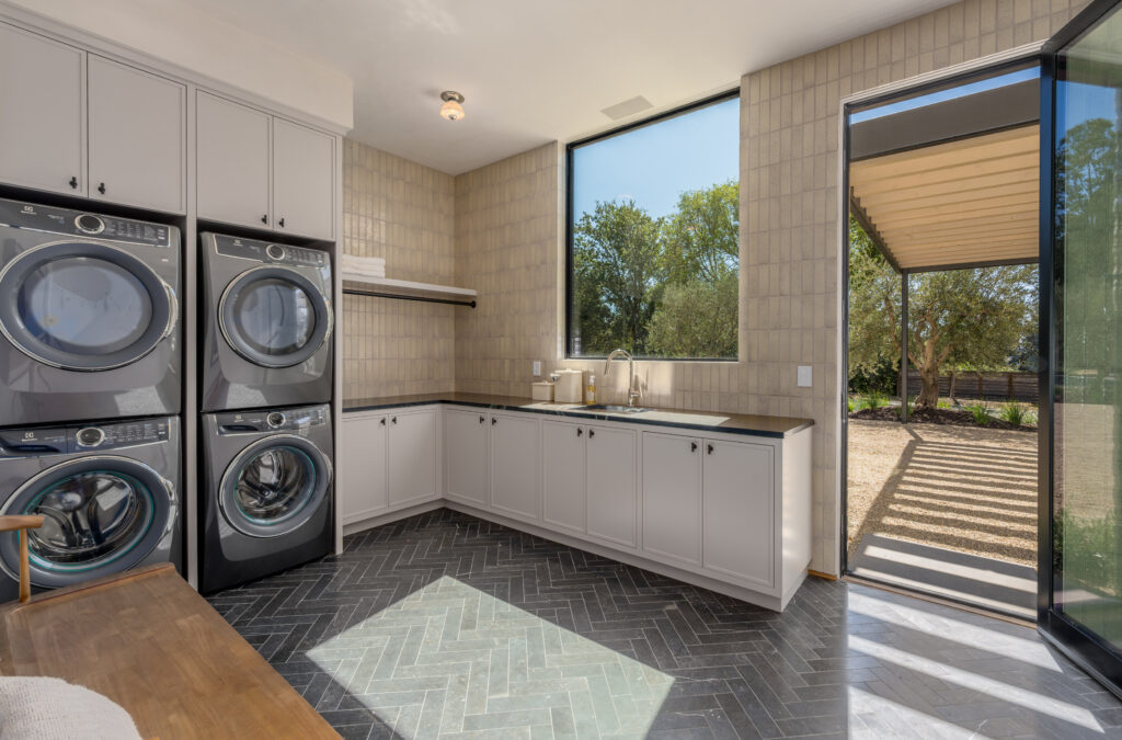 The long sweep of the entertaining space is open to the central courtyard and features a climate-controlled wine room, but there’s also a beautifully finished prep kitchen tucked away, and it’s the devotion to exceptional convenience and finish that really puts this house beyond others on the market. Below, what is probably the best looking laundry room in Northern California; a small oak-paneled private office in the primary suite; the sweep of the stairs to the second level; the primary suite bath and dressing area.