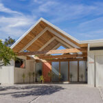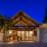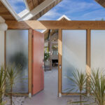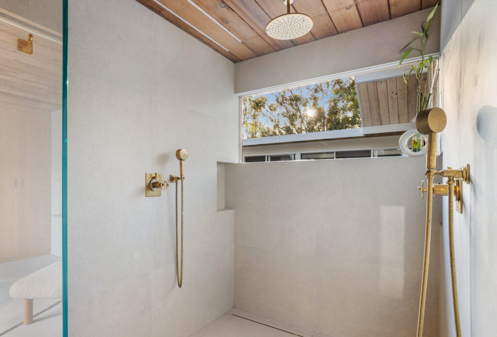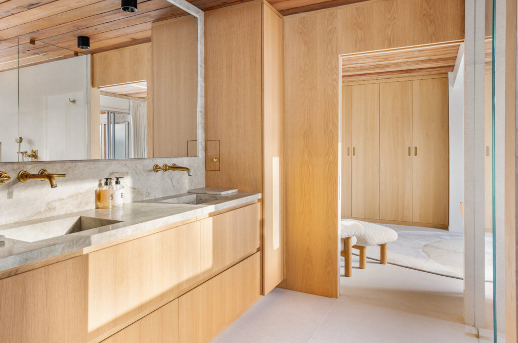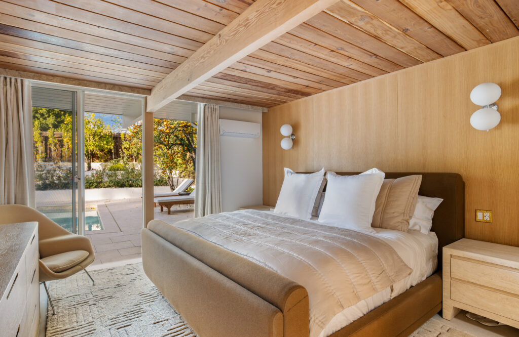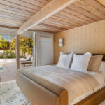The house had been expanded by both previous and current owners with the original post-and-beam construction. Below, the primary suite provides a luxurious, self-contained retreat, open to the outdoors.