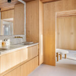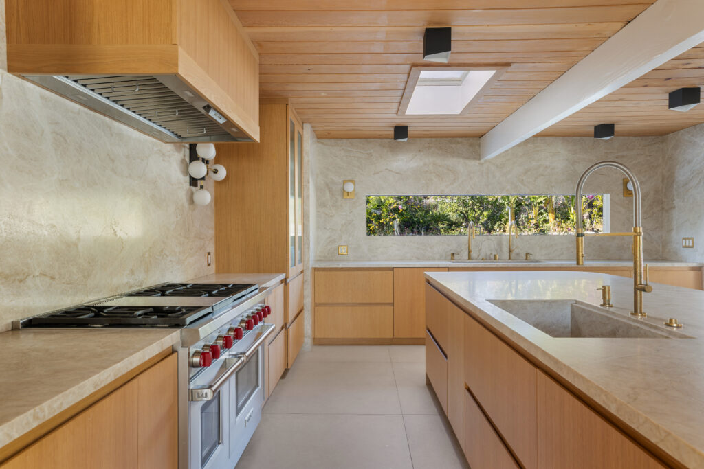 There’s the iconic Jones & Emmons atrium entry way; the restoration included hand sanding and finish of the tongue-and-groove planked ceiling and the original mahogany walls, and the kitchen has been completely transformed. Aside from the Venetian plaster, paint finishes throughout are Farrow & Ball.