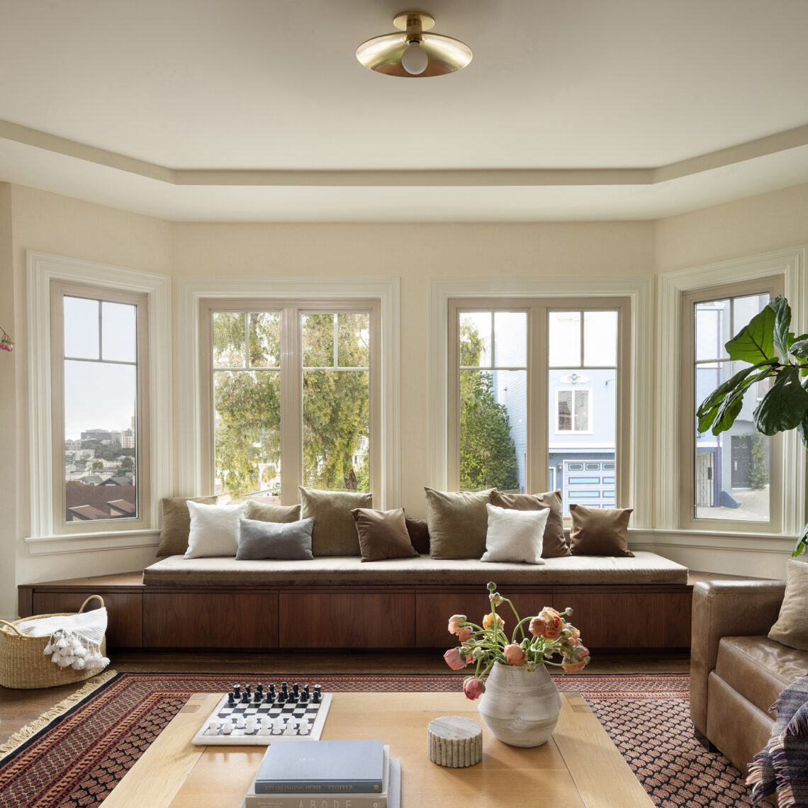 Nicole Gordon reimagines a California Ranch house as an oasis of rest and relaxation for a well-traveled client. Custom chairs, sofa and coffee table designed by Nicole Gordon Studio. The sofa is upholstered in a Classic Cloth fabric. A Rosemary Hallgarten fabric covers the club…