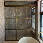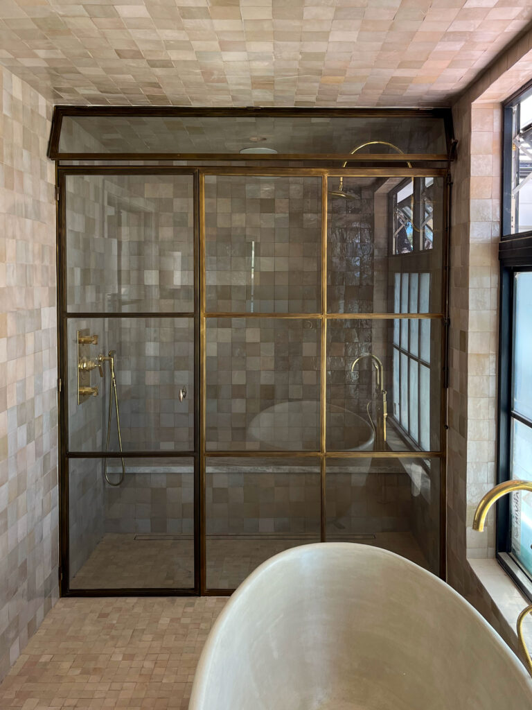 Designed by Formm Studio, De Winter made this custom burnished brass shower enclosure with an operational transom.