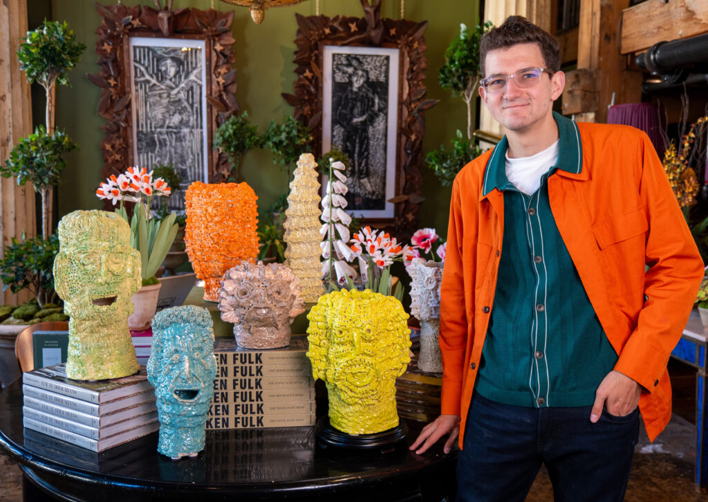 Ceramicist Cameron Caldwell with his vessels inside Ken Fulk’s San Francisco showroom.