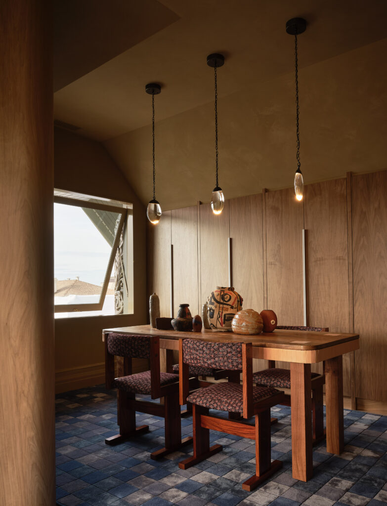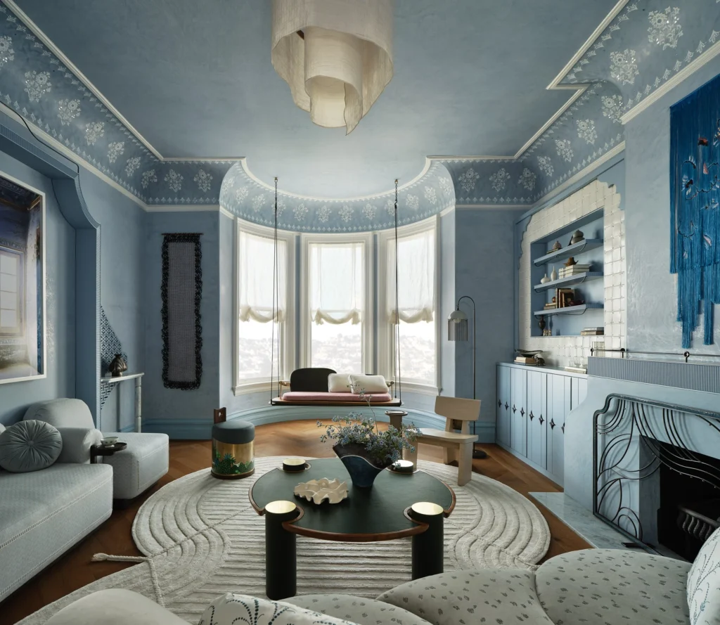 East meets West in the living room, where Sindhu Peruri accentuated the space’s high ceiling, classic mouldings and curved bay window with artistic flourishes. In addition to Caroline Lizarraga’s handpainted frescoes and Linda Fahey’s mirrored tiles, a hanging bench was customized with an ingenious adjustable backrest that allows its occupant to face the room or the view of the Golden Gate Bridge.