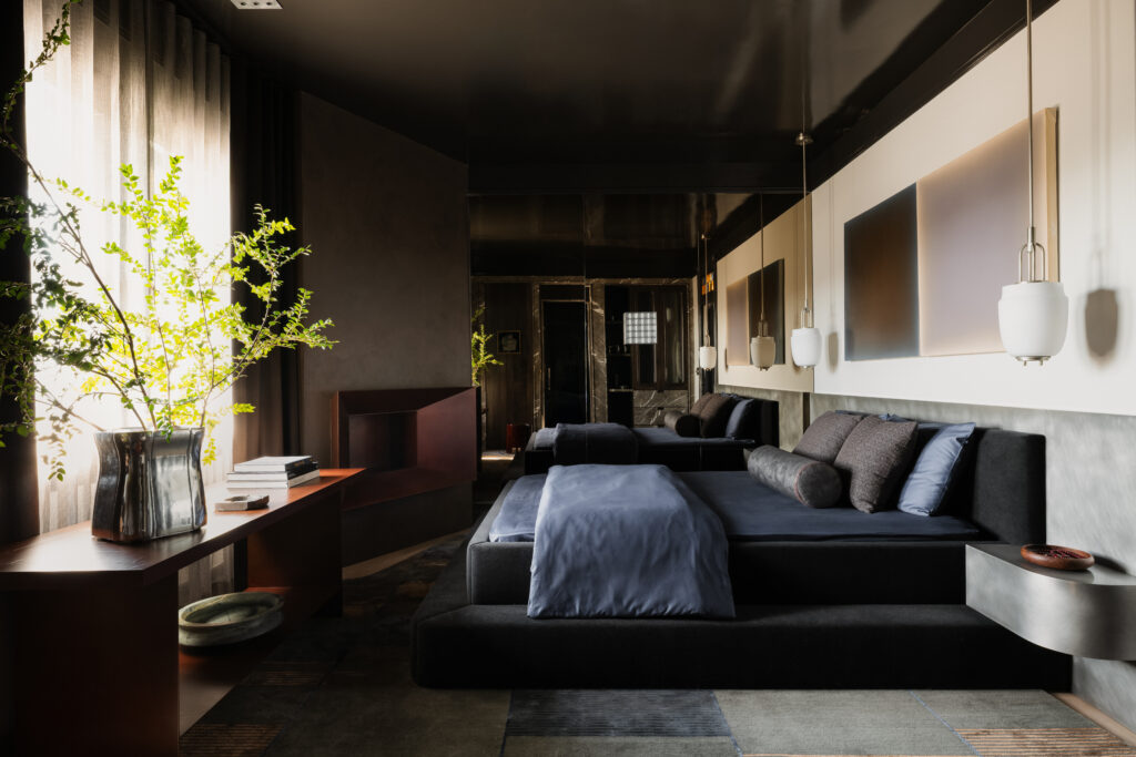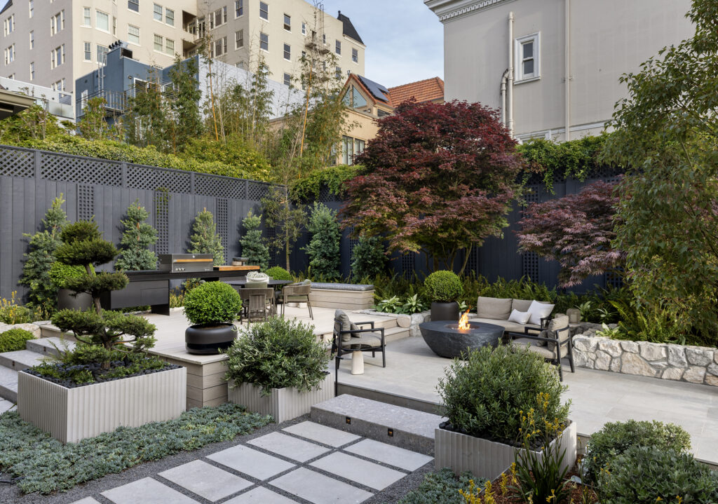 Taking inspiration from the Year of the Fire Horse, Russell Martinelli and Sami Burton conjured an alfresco oasis with a palette of earthy hues, punctuated by red foliage. From the sculptural waterfall fountain, limestone pavers lead to a boulder-shaped fire table surrounded by Poliform seating. Steps away, a dining table and chairs from De Sousa Hughes occupy a corner of the garden, along with a modular Poliform outdoor kitchen.