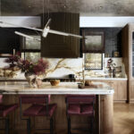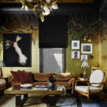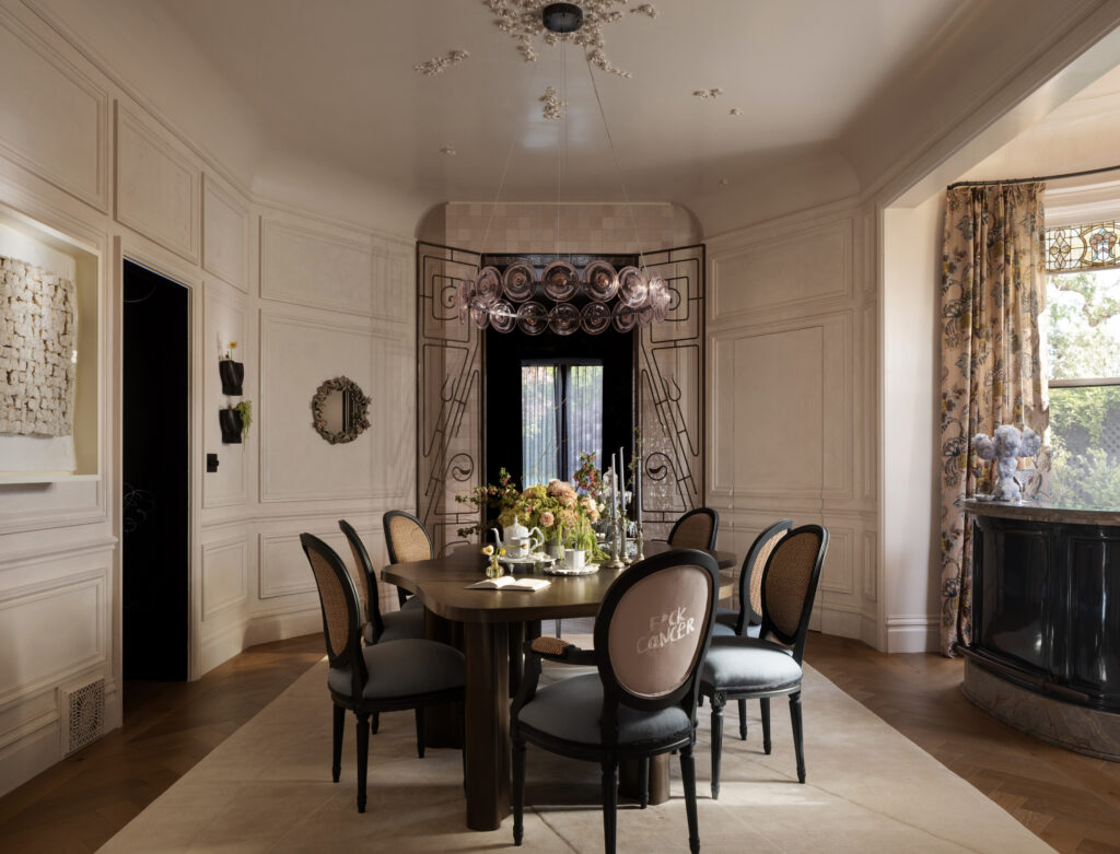 Stephanie Marsh Fillbrandt reimagined a basic white box of a room, imbuing it with architectural interest—most notably, changing the shape of the dining space to an octagon, complete with wood-paneled walls, and introducing iron gates by Lust Design Fabricate at entry points. Among the details: a jib door that hides a cashmere-lined silverware closet and a dining chair with a message (“F*ck Cancer”) that poignantly nods to a friend.