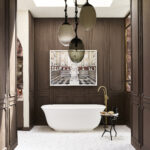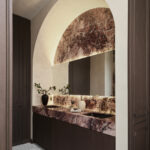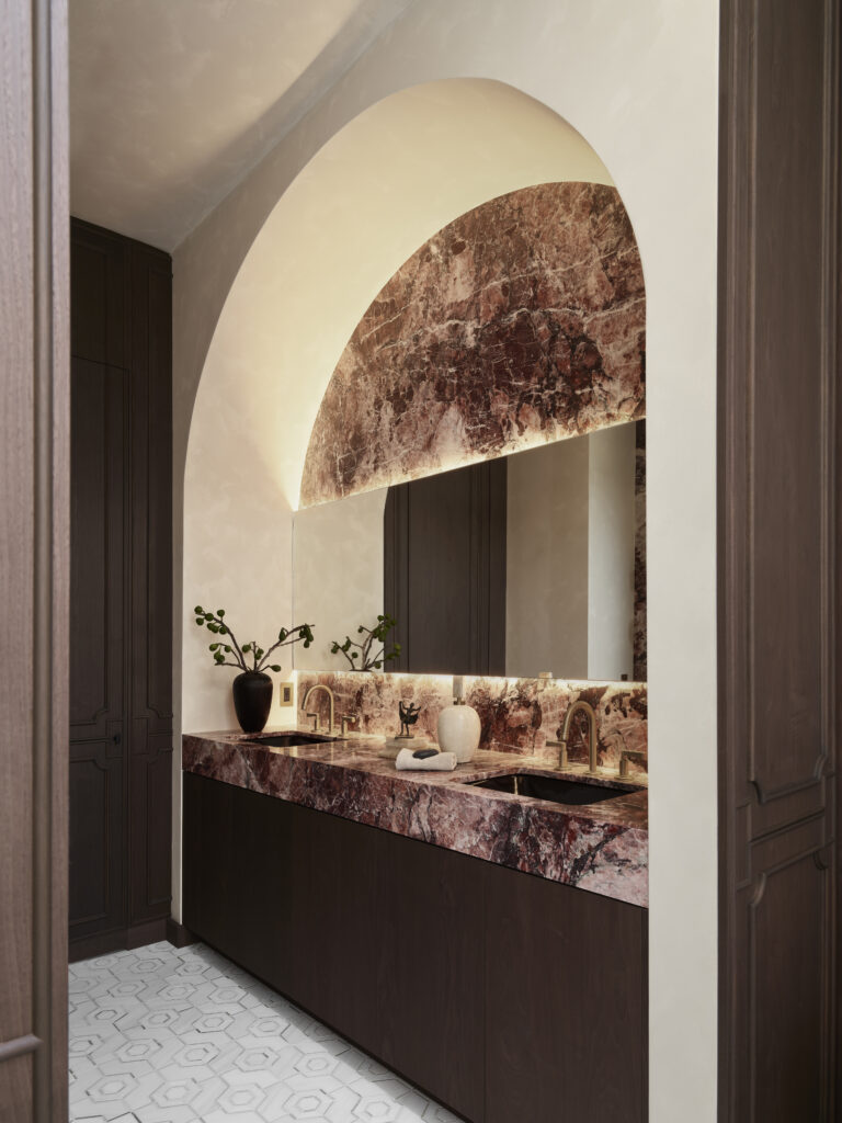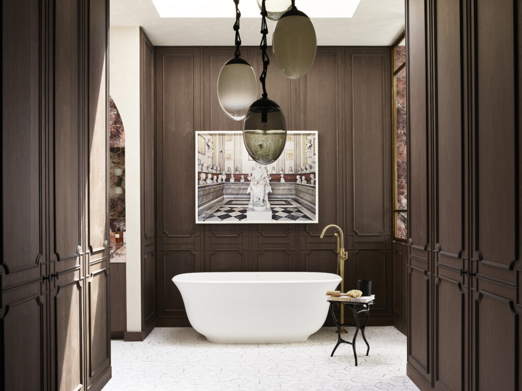 On the home’s second floor, the primary bathroom by Lizette Marie Bruckstein is at once an elegant retreat and a place where everyday rituals transpire. The space is awash in exquisite finishes and materials, like dark wood paneled walls, mirrored shower tiles from Ann Sacks, vintage brass plumbing, Color Atelier limewash paint and striking stone slabs from Da Vinci Marble. The serenity room indeed.