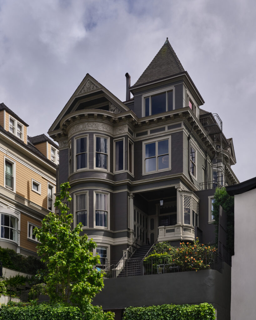 Alexander Nikban’s decidedly moody concept brings a Manhattan vibe to the top-floor en suite bedroom, where the designer also layered art deco elements. (The stained-glass transom by Angie OKO Designs feels very turn-of-the-century San Francisco, too.) Softening the roofline’s sharp angles are rounded silhouettes such as the custom double-platform bed upholstered in velvet. From the high-gloss ceilings to the plaster fireplace to the stone-clad millwork, there’s plenty to marvel at.