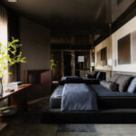 Ascend to the top floor for a den and bathroom designed by AubreyMaxwell’s Robbie McMillan, Marcus Keller and Caleb Morris, in conjunction with Everson Perez of Perez Construction. An ample tufted sectional from Coup D’Etat encourages reading, napping and simply hanging out, while a custom dining table by Michael Finizio Fine Woodworking adds to the room’s functionality. Down the art-lined hallway, the designers succeeded in manifesting a cool bathroom that includes lantern-like RBW sconces, wood cabinetry by Snake Craft and tiles by McIntyre Tile.