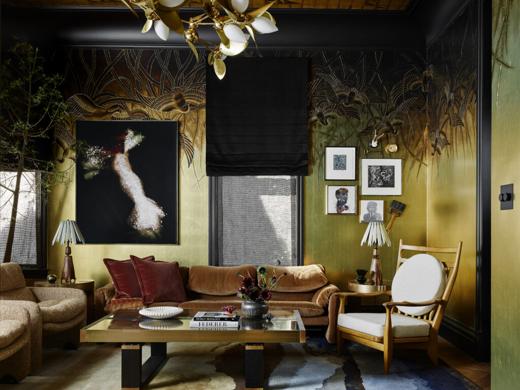 Tineke Triggs channeled the English countryside with a family room that invites lounging and next to it, a kitchen designed for cooking and gathering. The former wows with Fromental’s “Faisans” hand-finished gilded paper featuring pheasants, while custom cabinetry by UK-based Bakehouse Kitchens anchors the latter. And don’t miss the pantry, where a botanical mural by Caroline Lizarraga covers the walls and ceiling and the custom hood designed in collaboration with BlueStar Cooking.